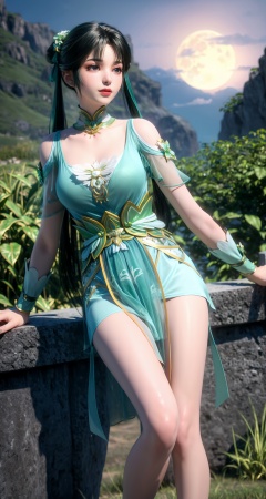 1girl,solo,hair ornament,dress,long hair,night,black hair,sky,hair rings,tree,ponytail,green dress,detached collar,ribbon,closed mouth,hair ribbon,anklet,twintails,lips,realistic,hair bun,outdoors,flower,hair flower,green eyes,clothing cutout,grass,mountain,jewelry,looking at viewer,blue sky,expressionless,shiny,bare shoulders,smile,leaf,bracer,necklace,rock,bare legs,thighs,leg tattoo,double bun,green nails,moon,night sky,cloud,full moon,scenery,cloudy sky,((sky)),star,nature,moonlight,plant,huge filesize,<lora:add_detail细节增加:0.7>,<lora:碧瑶:0.7>,<lora:MHB:0.2>,long_legs,