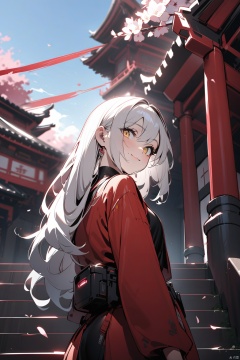 masterpiece, best quality, 1girl, yellow eyes, Beautiful face, delicate eyes, smile, long hair, white hair, tree, stairs, standing, sky, cherry blossoms, temple, looking at viewer, upper body, from below, looking back, ((Mecha)), young girl, Cyberpunk, CyberMechaGirl