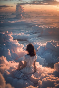 best quality,masterpiece,realistic,1girl, above clouds, solo, skirt, shirt, black hair, dress, sitting, short sleeves, outdoors, sky, cloud, medium hair, from behind, white skirt, cloudy sky, scenery, sunset, facing away