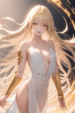 absurdres,1girl,solo,armor,full_shot,yellow eyes,blonde hair,arm up,medium breasts,looking at viewer,lotus strip road,shoulder armor,(pauldrons:1.1),floating hair,cleavage,smile,long hair,lips,glowing,gloves,(artbook:1.2),metallic luster,(background light:1.1),golden armor,golden tones,background with golden light,fine detail,perfect painting quality,lighting floats,(rotation trend:1.1),(dynamic diagram:1.1),,gyanmyo,(holy spirit:1.1),wide_shot,(glowing skin:1.2),true substance,housing architecture,(center diagram:1.1),golden lotus flying,elements of lava,white-lipped red,toplight,inverse light,
