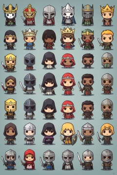 score_9, score_8_up, score_8, score_9, long hair, looking at viewer, short hair, multiple girls, blonde hair, simple background, brown hair, black hair, holding, closed mouth, standing, yellow eyes, weapon, multiple boys, sword, dark skin, hood, chibi, cape, holding weapon, armor, black eyes, mask, facial hair, holding sword, dark-skinned male, helmet, crown, hood up, 6+boys, shield, holding shield
