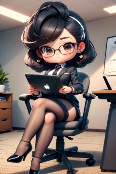 masterpiece,best quality,8K,official art,ultra high res,owo style,chibi,1girl,A sexy female secretary sitting on the ground,wearing a mini skirt,black stockings,and high heels. Confident posture,crossed legs,alluring expression,sleek and professional hairstyle,modern office setting,laptop or tablet in hand,stylish accessories,fashionable attire,contemporary office environment,seductive charm<lora:EMS-267958-EMS:0.800000>