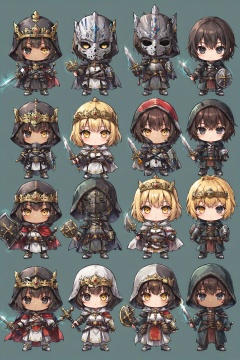 long hair, looking at viewer, short hair, multiple girls, blonde hair, simple background, brown hair, black hair, holding, closed mouth, standing, yellow eyes, weapon, multiple boys, sword, dark skin, hood, chibi, cape, holding weapon, armor, black eyes, mask, facial hair, holding sword, dark-skinned male, helmet, crown, hood up, 6+boys, shield, holding shield, wmchahua, loli