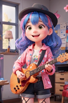 1girl, bangs, bass_guitar, belt, black_hair, black_jacket, black_shorts, blurry, blurry_background, breasts, cherry_blossoms, concert, confetti, electric_guitar, fishnet_legwear, fishnets, garter_straps, guitar, hat, holding, holding_instrument, instrument, jacket, long_hair, microphone, microphone_stand, multicolored_hair, music, open_clothes, open_jacket, open_mouth, petals, playing_instrument, plectrum, red_hair, blue_hair,pink_hairshirt, shorts, smile, solo, spotlight, stage, streaked_hair,thighhighs,迪士尼