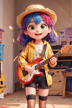 1girl, bangs, bass_guitar, belt, black_hair, black_jacket, black_shorts, blurry, blurry_background, breasts, cherry_blossoms, concert, confetti, electric_guitar, fishnet_legwear, fishnets, garter_straps, guitar, hat, holding, holding_instrument, instrument, jacket, long_hair, microphone, microphone_stand, multicolored_hair, music, open_clothes, open_jacket, open_mouth, petals, playing_instrument, plectrum, red_hair,blue_hair,yellow_hair,pink_hair,green_hair,orange_hair,shirt, shorts, smile, solo, spotlight, stage, streaked_hair,thighhighs,迪士尼
