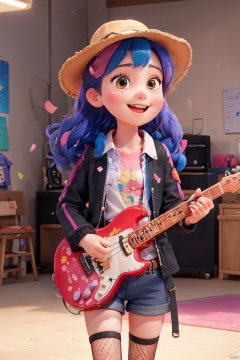 1girl, bangs, bass_guitar, belt, black_hair, black_jacket, black_shorts, blurry, blurry_background, breasts, cherry_blossoms, concert, confetti, electric_guitar, fishnet_legwear, fishnets, garter_straps, guitar, hat, holding, holding_instrument, instrument, jacket, long_hair, microphone, microphone_stand, multicolored_hair, music, open_clothes, open_jacket, open_mouth, petals, playing_instrument, plectrum, red_hair, blue_hair,pink_hairshirt, shorts, smile, solo, spotlight, stage,streaked_hair,thighhighs,迪士尼