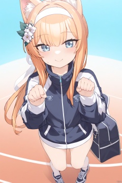 1girl, solo, long hair, looking at viewer, blush, smile, bangs, blue eyes, hair ornament, long sleeves, animal ears, closed mouth, standing, jacket, full body, ponytail, flower, hairband, shoes, hair flower, bag, orange hair, official alternate costume, animal ear fluff, hands up, from above, halo, white flower, blue jacket, sneakers, track jacket, white hairband, shoulder bag, multicolored jacket, two-tone jacket, mari \(blue archive\),kusakashi, loli, mariBA,mariGym