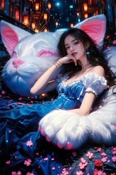 1girl, solo, long hair, looking at viewer, blue eyes, black hair, dress, bare shoulders, jewelry, sitting, short sleeves, earrings, parted lips, puffy sleeves, necklace, off shoulder, bracelet, lips, petals, blue dress, glowing, animal, cat, stairs