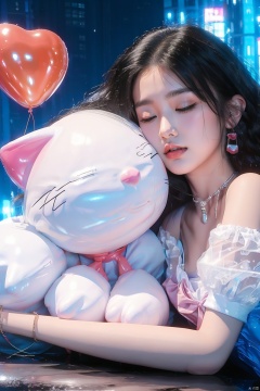 1girl, solo, short hair, black hair, dress, bare shoulders, jewelry, closed eyes, short sleeves, heart, earrings, necklace, bracelet, puffy short sleeves, lips, hug, makeup, night, cat, balloon