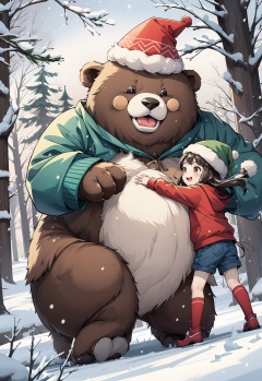 giant bear, children playing, winter, snow, nature, pine trees, festive hats, happy expressions, outdoor scene