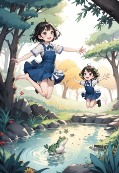 2girl, grass, children playing, jumping into water, joy, nature, pond, sunlight, cheerful, outdoor, trees, frog, smiling faces, camping tent, water splash, foliage