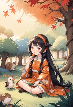 forest scene, young girl with headband, feeding birds, woodland animals, anthropomorphic creatures, autumn trees, dappled sunlight, whimsical, peaceful, child-friendly, sitting pose, girl interacting with nature, colorful foliage, pink and orange tones, floral patterns