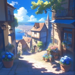 scenery, background, outdoors, sky, cloud, no humans, day, tree, ocean, blue sky, building, flower, plant, horizon, sign, water, potted plant, road, city, lamppost, town, house, blue flower, cityscape, window, bush, sunlight, pavement, door, street, path, cloudy sky, railing, stairs, flower pot, watercraft, fantasy, shade, tower, shadow ,