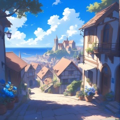 scenery, background, outdoors, sky, cloud, no humans, day, tree, ocean, blue sky, building, flower, plant, horizon, sign, water, potted plant, road, city, lamppost, town, house, blue flower, cityscape, window, bush, sunlight, pavement, door, street, path, cloudy sky, railing, stairs, flower pot, watercraft, fantasy, shade, tower, shadow ,