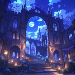 scenery, background, moon, no humans, night, sky, outdoors, stairs, cloud, barrel, building, night sky, blue theme, plant, window, lantern, tree, flower, fantasy, star (sky), arch, lamppost, ruins, cloudy sky, city, starry sky, architecture, railing, house ,