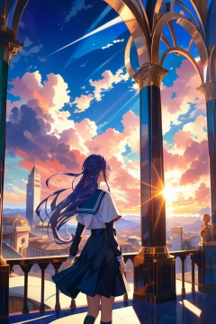 (casino:1.2), blue eyes, blue sky, building, cloud, cloudy sky, dress, from behind, hand up, long hair, long sleeves, outdoors, purple hair, sky, standing, sunset