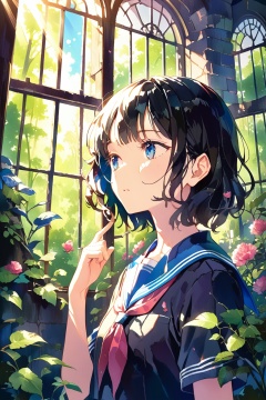sunlight, light rays, day, shadow, dappled sunlight, (forest, :1.3), black hair, blue eyes, blue sky, building, bush, closed mouth, flower, hand up, indoors, medium hair, outdoors, plant, sky, upper body, window