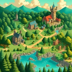 ((HRD, HUD, 8K)),((masterpiece, best quality)), highly detailed, soft light,GameScenes, tree, water, stairs, no humans, scenery, forest, nature, house, building, bridge, river, tower, chimney, outdoors, <lora:20240330-1711769468704:0.9>