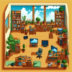 ((HRD, HUD, 8K)),((masterpiece, best quality)), highly detailed, soft light,GameScenes, no humans, computer, plant, shelf, chair, box, book, mouse (computer), potted plant, scenery, monitor, keyboard (computer), trash can, bookshelf, window, cup, laptop, desk, refrigerator, indoors, flower pot, sky, television, cabinet, cloud, table, wooden floor, door, game console, cardboard box, bulletin board, day, shadow, <lora:20240330-1711769468704:0.9>