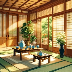 ((HRD, HUD, 8K)),((masterpiece, best quality)), highly detailed, soft light,GameScenes, no humans, plant, teapot, scenery, sunlight, table, potted plant, cup, teacup, indoors, tea, steam, window, light rays, kettle, architecture, flower pot, day, sliding doors, tatami, east asian architecture, tree, <lora:20240330-1711769468704:0.9>