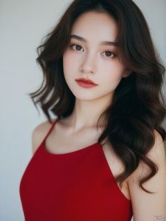 [woman with white skin: 1.2, long curly hair: 1.2, elegant red dress, flat nose, bright brown eyes], portrait, VSCO filter: C8)