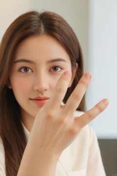 1girl,(open hand:1.2),neutral background with soft lighting,subtle office setting,daytime,(looking directly at the camera:1.2),close-up shot,approachable and confident,nice hands,perfect hands,8k,Best quality,realistic style. five fingers ,thumb,forefinger,middlefinger,ringfinger,littlefinger