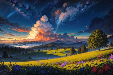 scenery,outdoors,sky,no humans,star \(sky\),mountain,mountainous horizon,flower,starry sky,grass,landscape,shooting star,nature,tree,blue sky,sunset,field,night,night sky,plant,hill,evening,masterpiece,best quality,very aesthetic,absurdres,<lora:StarryMountainWilderness:0.7>,