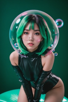 hubggirl,1girl, The girl was inside bubble, 1girl,alluring pose, ,floating hair,,blacklight,(surrounded by bubble:1.3),spotlight, green hair, pink background, dark theme,(a lot of bubble:1.3),eye_contact,