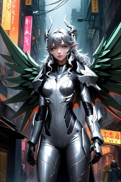 {{master piece}},best quality,illustration,1girl,small breast,beatiful detailed eyes,beatiful detailed cyberpunk city,flat_chest,beatiful detailed hair,wavy hair,beatiful detailed steet,mecha clothes,robot girl,cool movement,sliver bodysuit,{filigree},dargon wings,colorful background,a dragon  stands behind the girl,rainy days,{lightning effect},beatiful detailed sliver dragon arnour,(cold face), myinv, (\lang lang\),  tera kas