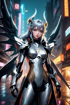 {{master piece}},best quality,illustration,1girl,small breast,beatiful detailed eyes,beatiful detailed cyberpunk city,beatiful detailed hair,wavy hair,beatiful detailed steet,mecha clothes,robot girl,cool movement,sliver bodysuit,{filigree},dargon wings,colorful background,a dragon  stands behind the girl,rainy days,{lightning effect},beatiful detailed sliver dragon arnour,(cold face), myinv, (\lang lang\), tera kas