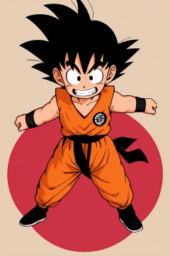 1 boy,black eyes,black hair,boots,cupping hands,dirty,dougi,fingernails,foreshortening,full body,grin,happy,leaning,looking at viewer,male focus,orange background,outstretched arm,outstretched arms,outstretched hand,reaching,reaching out,shadow,short hair,smile,solo,son goku,spiked hair,star \(symbol\),teeth,wristband,<lora:蔚蓝Blue小悟空2.0:0.8>