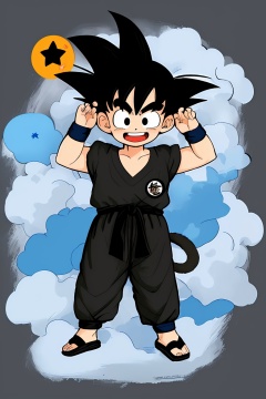 1 boy,:d,black eyes,black hair,clenched hands,cloud,cloudy sky,dougi,fingernails,happy,male focus,open mouth,sky,smile,solo,son goku,spiked hair,star \(symbol\),starfish,tail,teeth,v-shaped eyebrows,wristband,<lora:蔚蓝Blue小悟空2.0:0.8>