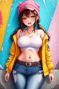 1girl,:d,bangs,bare shoulders,baseball cap,belt,blue pants,breasts,brown eyes,brown hair,cleavage,collarbone,crop top,denim,graffiti,hand on headwear,hat,jacket,jeans,jewelry,large breasts,long hair,long sleeves,looking at viewer,midriff,navel,necklace,off shoulder,open clothes,open jacket,open mouth,pants,shirt,smile,solo,torn clothes,torn jeans,torn legwear,torn pants,torn shorts,twintails,white shirt,yellow jacket,Best quality,high resolution,sharp images,best quality,high resolution,clear images,original figures,natural volume lighting and best shadows,deep field depth,sharp focus,shockingly beautiful portraits of petite girls,soft delicate beautiful charming face with alluring yellow eyes,cute little breasts,sharp eyeliner,soft and delicate Seductive smile,open mouth with cute fangs,cape messy brown hair,thick layered medium twine hairstyle,blush eyeshadow with thick lashes,parted lips,Apple Jack hat,oversized Pop Art jacket,slim waist with open cute navel,denim jeans pants with buckle,(messy painted body :1.05),(hand-held spray paint can :1.1),(Graffiti mural wall background :1.15),(Standing in a narrow city street crossword :1.2), <lora:蔚蓝Blue瑟瑟:0.8>