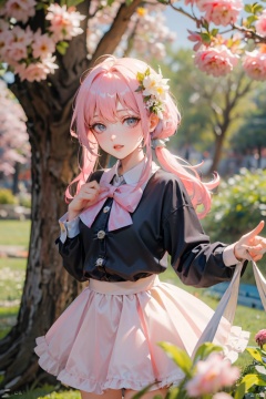 1girl breathtaking 8k, masterpiece, perfect beautiful chinese girl, upper body, vibrant, vivid, (short skirt), petticoat, (flowers), chiffon, sheer, light smile, bloom, award-winning, professional, Among colorful flowers garden, houtufeng, lhj, bright light, flower, blurry, pink flower, still life, cherry blossoms, sboe