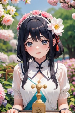 1girl breathtaking 8k, masterpiece, perfect beautiful chinese girl, upper body, vibrant, vivid, (flowers), chiffon, sheer, light smile, bloom, award-winning, professional, Among colorful flowers garden, houtufeng, lhj, bright light, flower, blurry, pink flower, still life, cherry blossoms, sboe, Anime