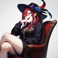 u u zan,1girl, masterpiece, best quality, solo, sitting on chair, crossed legs, pov, full body, hand up, detailed eyes, absurdres, extremely detailed, cardigan, rating: safe, perfect features, makeup, eyeliner, intricate details, ultra resolution image, laughing, fang, smug ,, red hair, hat feather<lora:EMS-322114-EMS:1.000000>