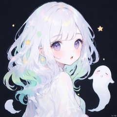 1girl, solo, long hair, looking at viewer, blush, bangs, simple background, shirt, purple eyes, white shirt, upper body, white hair, multicolored hair, parted lips, green hair, looking back, star \(symbol\), :o, black background, ghost,illustration