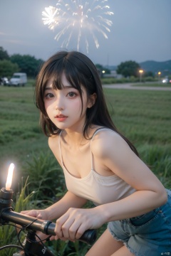 ahj, fireworks, sky, night, scenery, outdoors, night sky, multiple boys, grass, ground vehicle, bicycle, aerial fireworks, sign ,night,