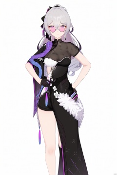 yeman, chinese clothes, 1girl, gloves, tinted eyewear, black footwear, black single thighhigh, sunglasses, black dress, long hair, asymmetrical gloves