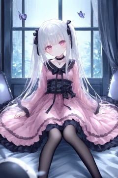 1girl, loli, blush, long hair, white hair, straight hair, twintails, pink dress,