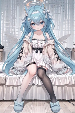 1girl, solo, long hair, blue eyes, hair ornament, thighhighs, long sleeves, dress, very long hair, blue hair, collarbone, jacket, tail, hairband, wings, horns, off shoulder, white dress, sleeves past wrists, thigh strap, halo, single thighhigh, electric plug tail, electric plug, asymmetrical legwear, blue footwear, slippers, ribbon, hair ribbon, asymmetrical socks, power symbol, wangbaobao, ((bedroom)), ((sitting on bed))