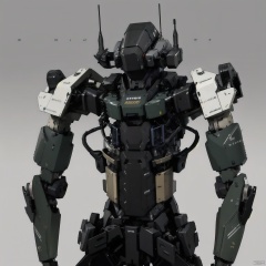 solo, upper body, weapon, grey background, english text, gradient background, no humans, robot, mecha, science fiction, realistic