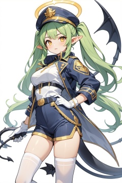1girl,upper body,white background, ultra-detailed,best quality,(masterpiece),highlander-right,yellow eyes,green hair,twintails,long hair,pointy ears,halo,demon tail,jacket,shorts,arm band,white pantyhose,white gloves,peaked cap,boots,highlander-right,, masterpiece,best quality,very aesthetic,absurdres,