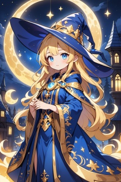 a blonde, blue-eyed cute Wizard girl standing on a moonlit night. A colorful, sparkling halo appears and colors the scene. She wears a wizard hat with gold embroidery and luxurious blue robes, creating a mysterious atmosphere.,blue moon, masterpiece,best quality,very aesthetic,absurdres,