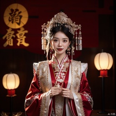 mamianqun, masterpiece, best quality, 32k uhd, hdr, dtm, cinematic lighting effects, wide shot, wide-angle lens,super vista, super wide angle, exquisite facial features, super delicate face, best fingers,High quality, 1 girl, festive red, full body lens, black hair, looking at the audience, hair accessories, brown eyes, jewelry, shut up, red happy clothes, earrings, outdoor, sky, hair bun, night, Chinese clothes, prints, shawls, tassels, star sky, moon, Yuanxiao (Filled round balls made of glutinous rice-flour for Lantern Festival), hanfu, hydress, red and gold dress, girl, hair,Facial shape,