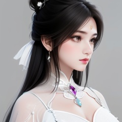 1girl,portrait,simple background,black hair,hair ornament,dress,jewelry,closed mouth,earrings,grey background,white dress,looking to the side,single hair bun,forehead mark,realistic,catfish bangs,hair down to chest,very long hair,<lora:lbc_luxueqi_240331_v1.1-000009:0.9>,