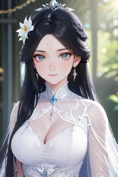 8K,highres,absurdres,masterpiece,best quality,original,extremely detailed CG,extremely detailed wallpaper,perfect lighting,1girl,black hair,catfish bangs,very long hair,hair down to chest,looking at viewer,hair ornament,dress,white dress,jewelry,closed mouth,upper body,earrings,blurry,blurry background,forehead mark,sunlight,<lora:lbc_luxueqi_240331_v1.1-000009:0.8>,