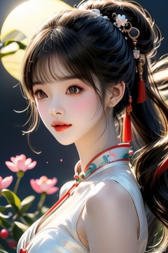 Ultra fine painting, a beautiful girl with Chinese style, slim face, closed mouth, black eyes, black and white gradient long hair, peach blossom, half body lens, ponytail, tassels, decoration, white dress, sheer, gazing at the moon in the night sky, calm, light: soft, Spring Festival, moon, ultra fine, 2K, ultra clear,