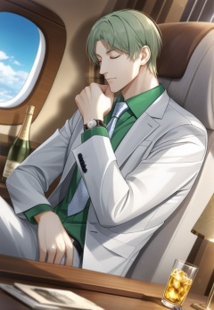 (best quality), ((masterpiece)), (highres), illustration, original, extremely detailed,   <lora:光与夜之恋同人人物篇:0.7>cls, watch, 1boy, male focus, drinking glass, solo, shirt, cup, wristwatch, green shirt, short hair, bottle, indoors, sitting, formal, long sleeves, collared shirt, closed eyes, necktie, closed mouth, jacket, white jacket, suit, window, alcohol, wine bottle