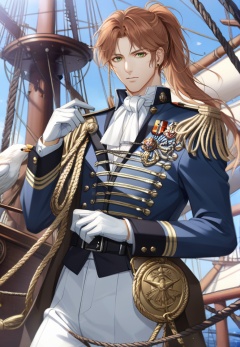 (best quality), ((masterpiece)), (highres), illustration, original, extremely detailed,   <lora:光与夜之恋同人人物篇:0.7>xmx, 1boy, male focus, brown hair, green eyes, long hair, solo, white ascot, white gloves, gloves, medal, military, weapon, sword, ascot, aiguillette, white pants, uniform, pants, military uniform, jacket, looking at viewer, ponytail, belt, brooch, epaulettes, long sleeves, bird, ship, day, standing